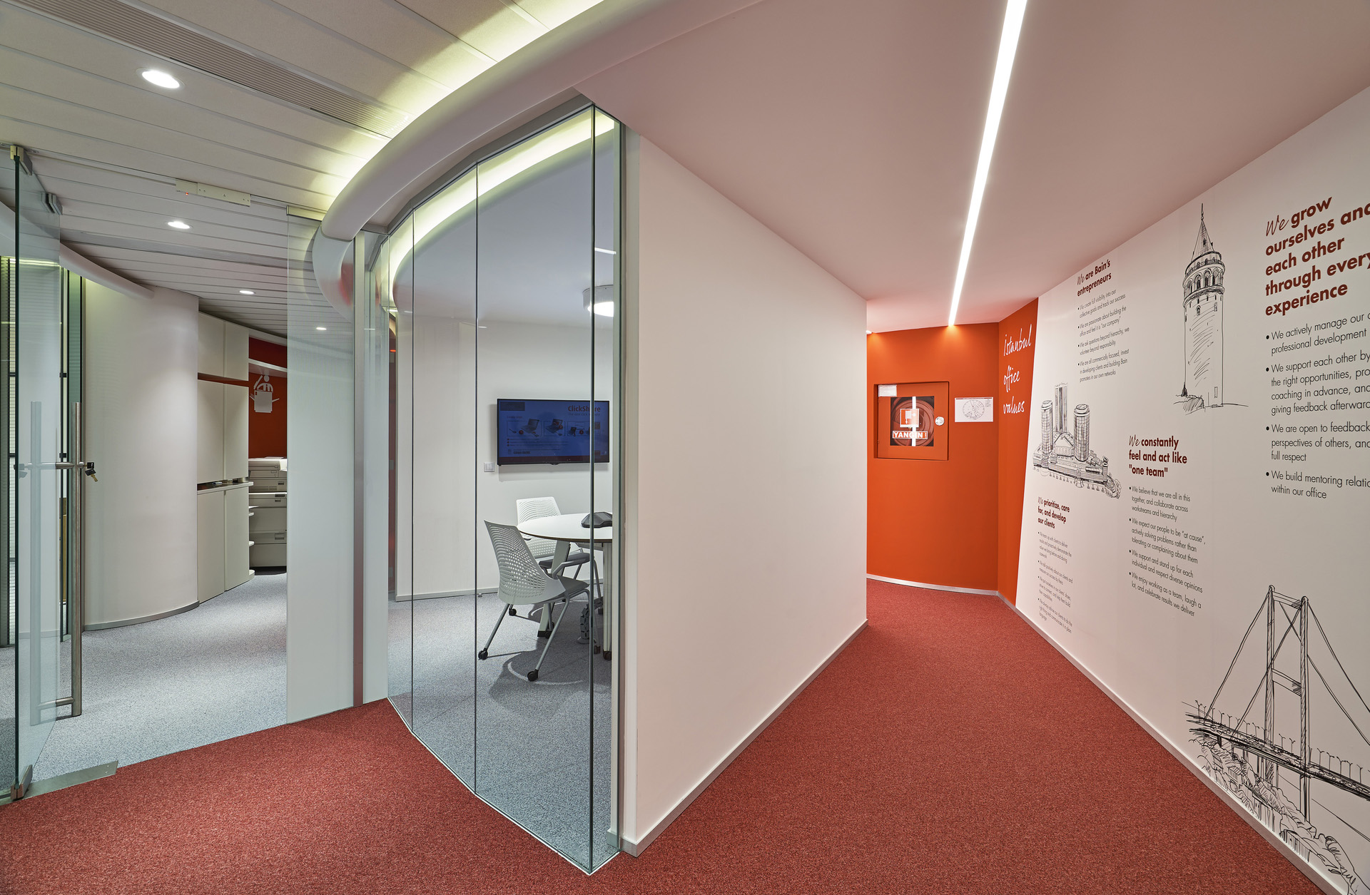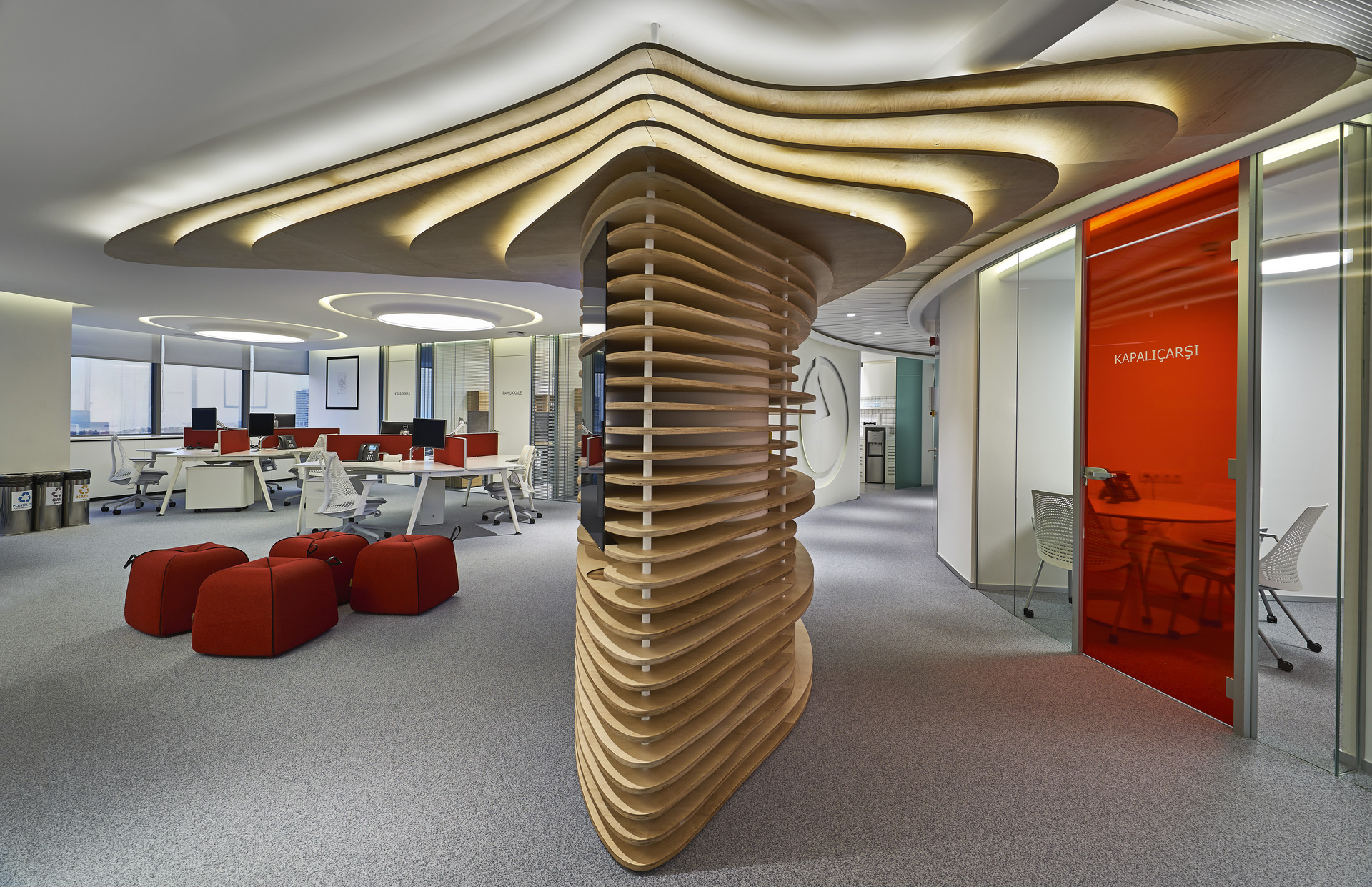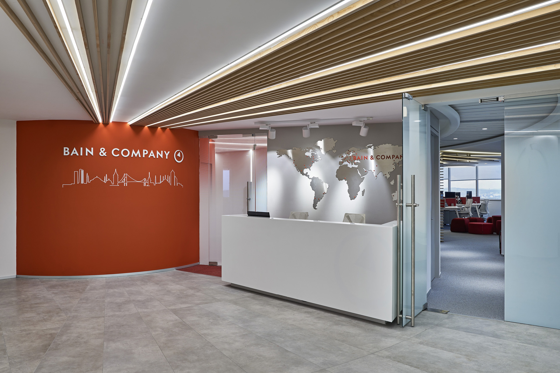 10. katta panoramik boğaz manzarasına sahip olan dairesel formdaki ofisin iç mimari projesi ve grafik tasarımı, Bain & Company için Net mimarlık tarafından tasarlanıp uygulanmıştır. Binanın dairesel geometrisini verimli kullanan etkin alanlara sahip ofis tasarımı hedeflenmiştir. Tasarım sürecine merkezden dairesel eksen oluşturulmakla başlanmış ve onu daha küçük bir dairesel eksenle ayırmakla devam etmiştir. Bu ofis tasarımı ile açık ofisler, kapalı ofisler ve toplantı odaları için dik yamuklar yaratılmıştır. Odak noktası ise insanları hem iş hem de sosyal amaçlar için bir araya getirecek çok amaçlı intekaktif bir birim tasarlamak olmuştur. Bu alan, ofisin hem sirkülasyon alanına hem de ofis alanlarına bakan ortak alanında yer almıştır. Özel ofis mobilyası tasarımı, konferans salonu ve toplantı odaları tasarımlarıyla tamamı ile fonksiyonel bir ofis tasarımı yapılmıştır. Katmanlı ham ahşap ünite, tüm donanımları gizlerken aynı zamanda geçirgen bir bölücü olarak kullanılmıştır. Organik akışkanlık dairesel bina formundaki pahlı köşe tavan tasarımı sayesinde homojen ışık yansıması yaratılmıştır. Bu sayede yayılan ışık sayesinde alçak tavandan kaynaklanan olumsuz etkiler ortadan kaldırılmıştır. Doğal ışığın merkeze geçişi için cepheye paralel dairesel aks oluşturulmuştur. Doğal ışık dairesel eksen üzerinden geçerken, saydam malzeme sayesinde ışığı ayrıca toplamıştır.